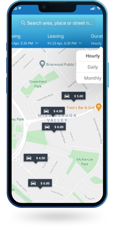 Find all available parking spots near you and book the one that fits your budget and time!